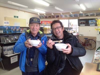2時間余に渡る寒い洋上での収録後は、遊覧船案内所に立ち寄りいただき、撮影クルーに奥松島産のあったかくて美味しい牡蠣汁を振る舞い、大変喜んでいただきました。