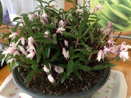 ピンク色の可憐な花を咲かせる野生ランの希少種”セッコク”が、嵯峨渓遊覧船案内所で甘い香りを放って乗船客を楽しませています。鉢に植えて育てているのは遊覧船船長の郷右近さんですが、自宅には大小十数鉢の花たちが咲き乱れているそうです。