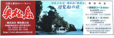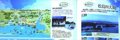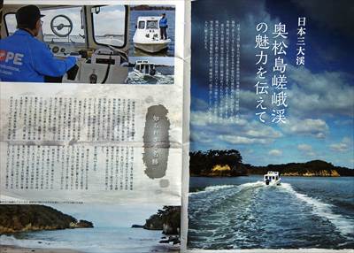 特に観光客が利用する県内80箇所あまりの旅館・ホテルに配布されていますので、注目度の高い媒体です。こちらも巻頭見開きページの記事として、大高森の「壮観」の眺望と「奥松島遊覧船」の案内が地図と写真入りで紹介されました。