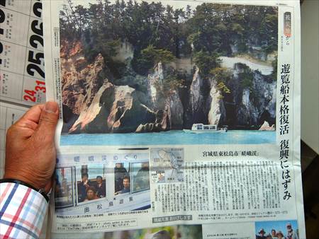4月20日発行の産経新聞日曜全国版の、”被災地から”という特集ページの全面を使って、嵯峨渓の遊覧船風景が大きな写真とともに紹介されました。記事のタイトルは”遊覧船本格復活 復興にはずみ”というもの。”白く切り立った岩肌が青い海に映える日本三大渓のひとつ「嵯峨渓」・・・・・・”に始まる本文は、”遊覧船復活は東松島復興のシンボル”という文言で締めくくられていました。