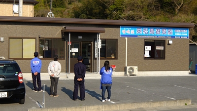 観光客はもとより、通りすがりの近所の人にさえ認知度の低かった案内所の存在。構想から半年を経て、GWを目前にした4月25日に念願の看板を設置することが出来ました。嵯峨渓をイメージしたマリンブルーの下地に、ブルーインパルスの群青色で文字を浮き立たせるという東松島バージョンは、スタイリッシュですっきりとした印象の看板です。