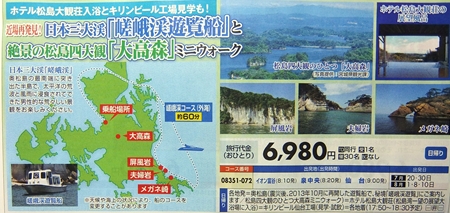 絆ツアーのタイトルで、年間3000名を超えるお客様を嵯峨渓遊覧船に案内して頂いている首都圏のクラブツーリズムさん。抜群の企画力と集客力を生かして、被災地支援関連ツアーの中でも抜群のヒット商品を連発中の旅行会社です。そんなクラブツーリズムの仙台旅行センターさんにも、夏の日帰り企画として「嵯峨渓遊覧船」を取り上げてもらうことが出来ました。ツアータイトルは、”近場再発見 日本三大渓「嵯峨渓遊覧船」と絶景の松島四大観「大高森」”という、まんまのツアータイトルです。夏休みの家族連れを中心に、近場の秘境に足を運んでもらおうとのポイントで、200名の集客が目標です。
