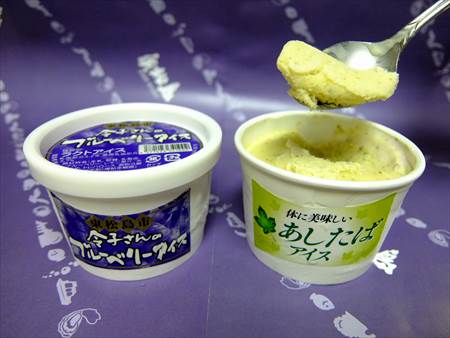 ところで今回扱っている商品をアイスクリームではなく”アイス”と称している理由がわかりますか。それは厚労省が決めている乳脂肪分の含有比率の規定に基づくからです。一般的にアイスクリームと総称される冷たい氷菓?ですが、乳脂肪分が8%以上の製品をアイスクリームといい、3%以上のものがアイスミルク。3%未満のものはラクトアイス又は氷菓と分類され、今回販売している”ブルーベリー”と”あしたば”は、乳脂肪が5.8%と3.2%のためアイスクリームとは表記されず、「アイス」もしくは「アイスミルク」という分類になります。看板にも”アイスクリームあります”とは書けないのです。パーキングに立ち寄ったときは是非とも味見していってください。