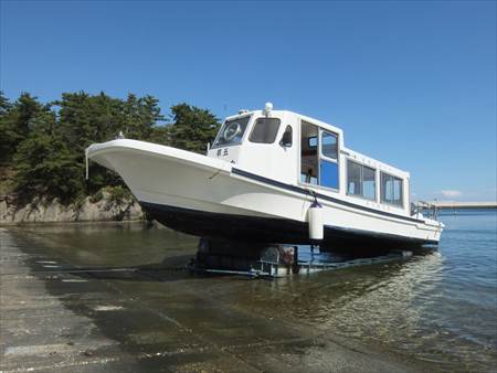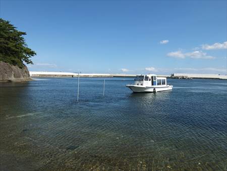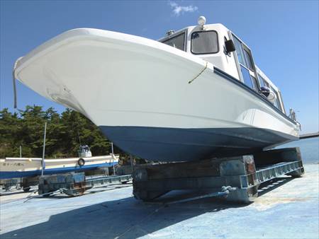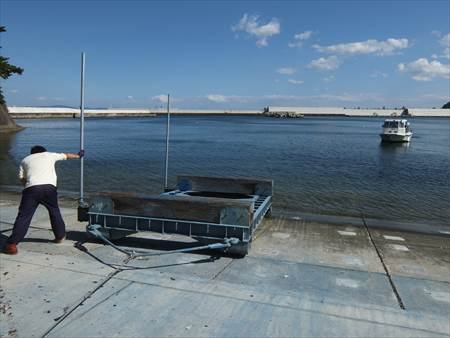 DSCF9661_Rこの日は連休明けの平日で団体予約もなかったことから、船底掃除の日となりました。近所の漁協の協力を得て、まずは台車をウインチで海上に押し流す。この台車の上に遊覧船を上手いこと浮かばせたところで、ウインチで少しずつひき寄せて岸壁に引き上げます。